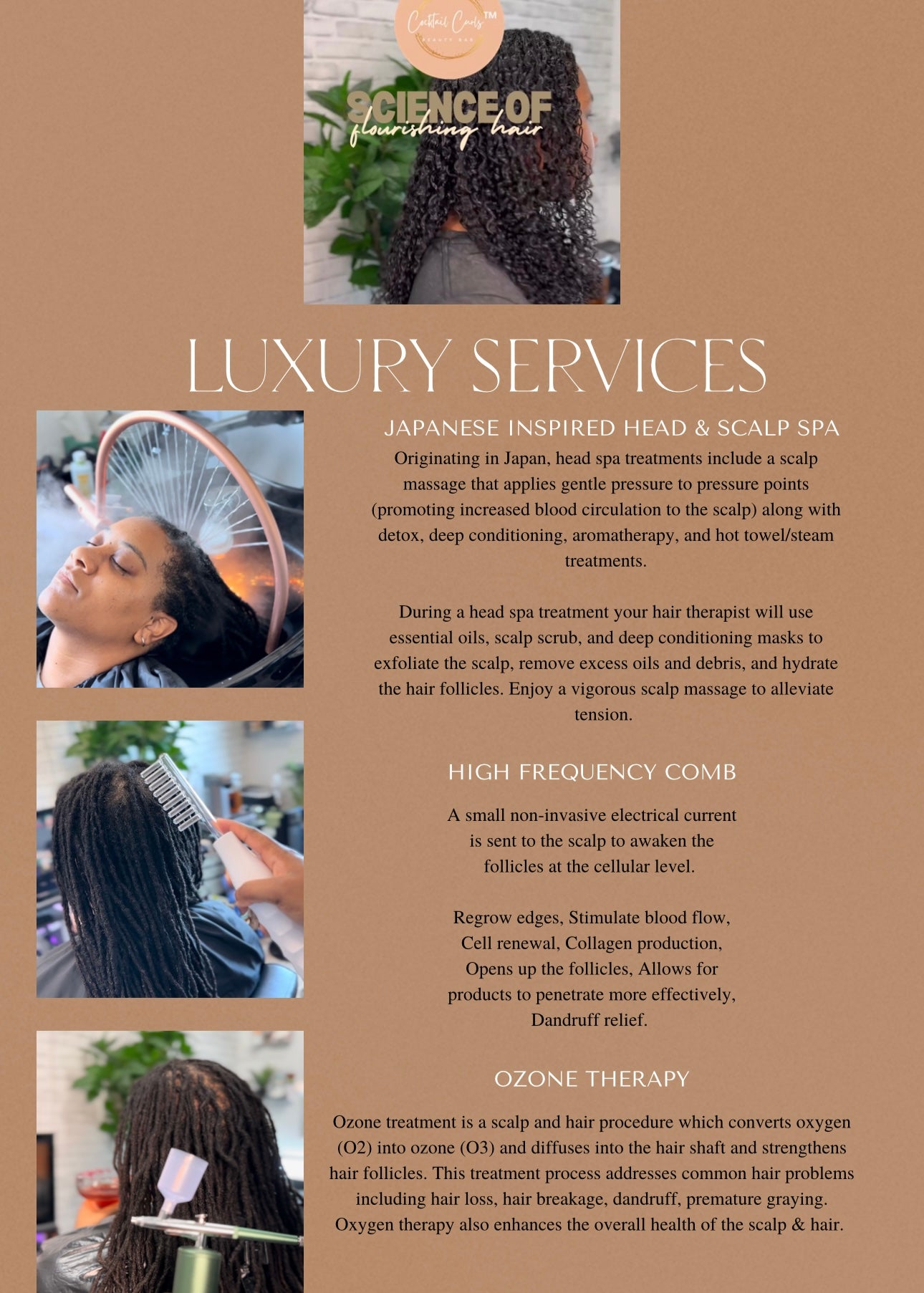 - Everything for healthy hair care is included for your service! You receive a shampoo, customized treatment, steam hydration, and scalp therapy. If you would like to add a style you can do so right online when you book your appointment.